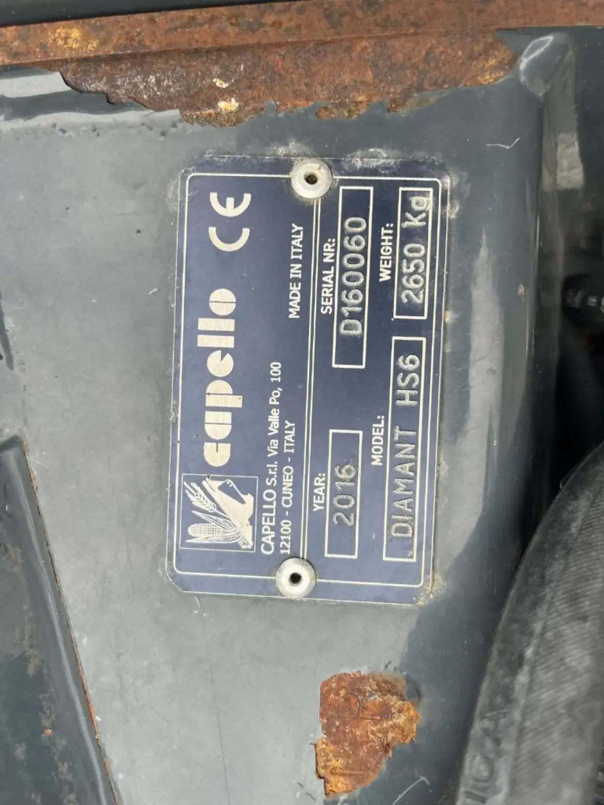 Cueilleur de marque Capello de type Diamant HS6 Année 2016 6 rangs Ecartement 75 cm Broyeur Repliage hydraulique Attelage New Holland Suivi de sol Diviseurs rotatif