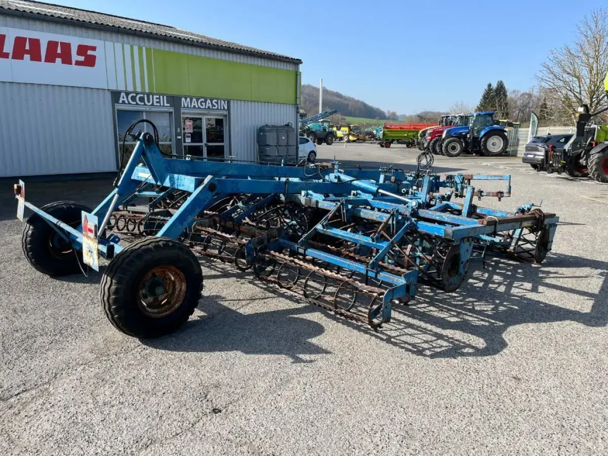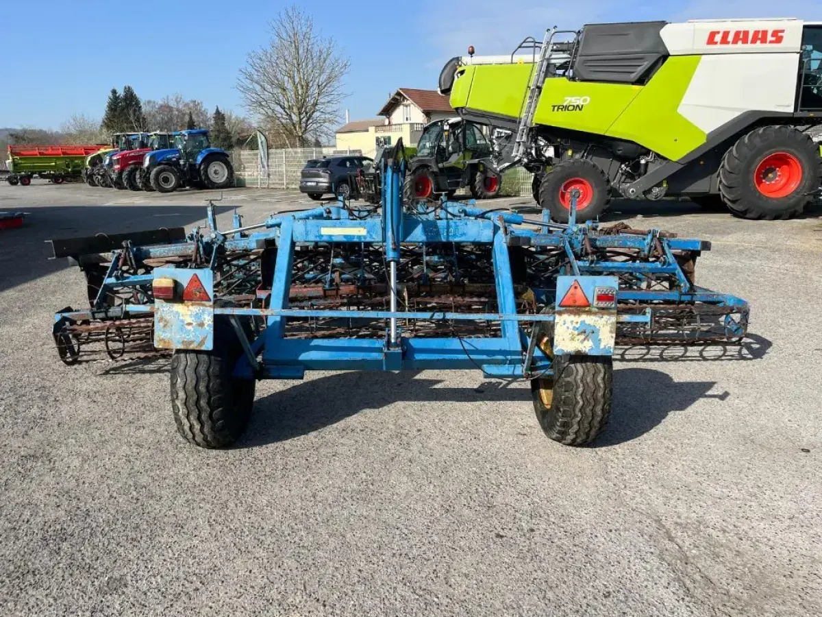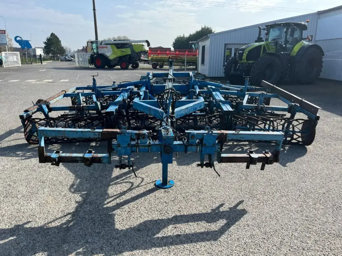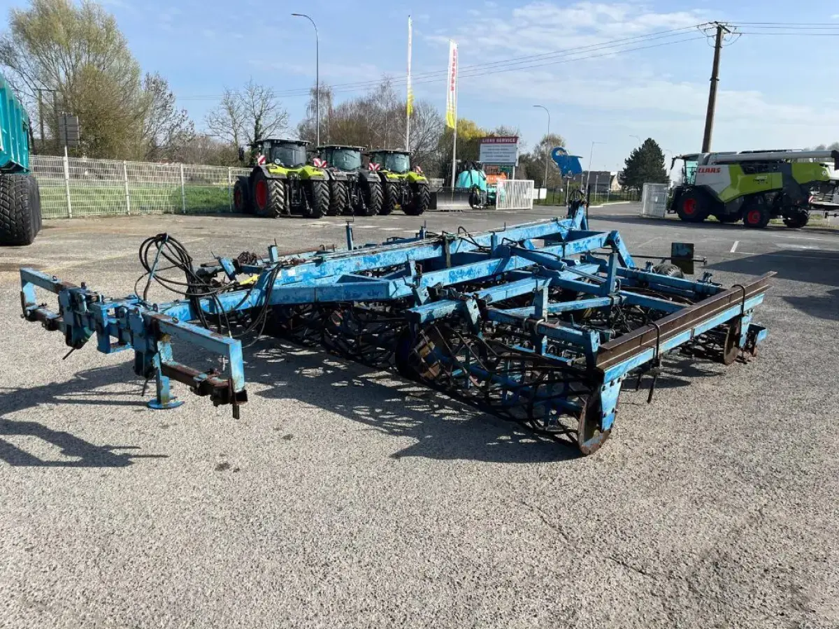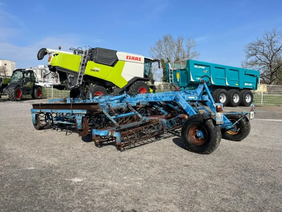 Préparateur de sol de marque RELIGIEUX de type COMDOR Année 1995 5.2 mètres Rouleau diamètre 500 Planche niveleuse 5 rangées de dents vibro Double rotoherse Attelage semi porté avec support pour effaces traces Une barrette de rouleau manquante Quelques dents et soc vibro à remplacer Palier à contrôler